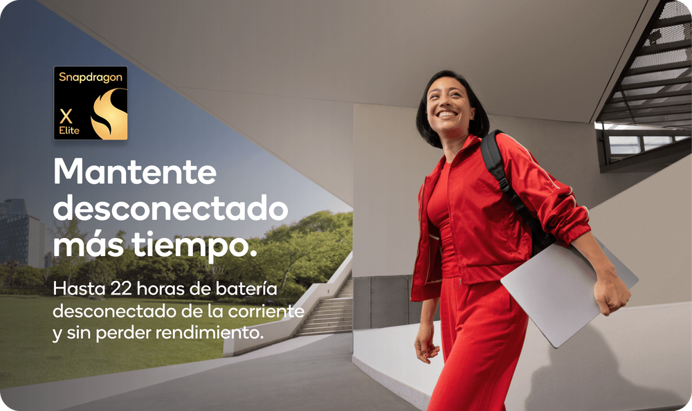 Toma el control, todo el día. Solo las PC con procesadores Snapdragon® X Series mantienen su rendimiento al máximo cuando están desconectadas, con una batería que dura varios días y rompe todos los límites.